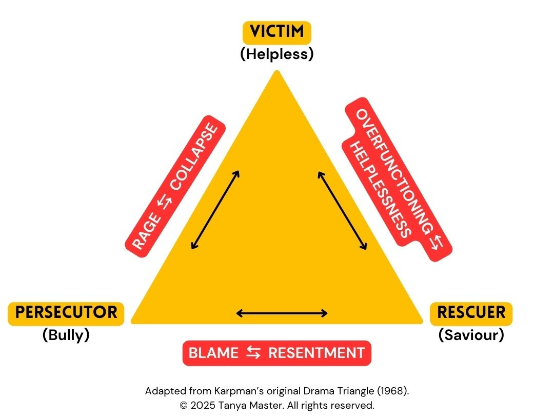 The Drama Triangle isn’t just a set of behaviours; it’s a system of outsourcing. When worth, boundaries, or protection were never internalised, they get projected outward. You start relying on others to make you feel safe — to rescue you, validate you, recognise your needs, or absorb the blame. And when they don’t (or won’t), the system breaks. And that’s where healing begins.